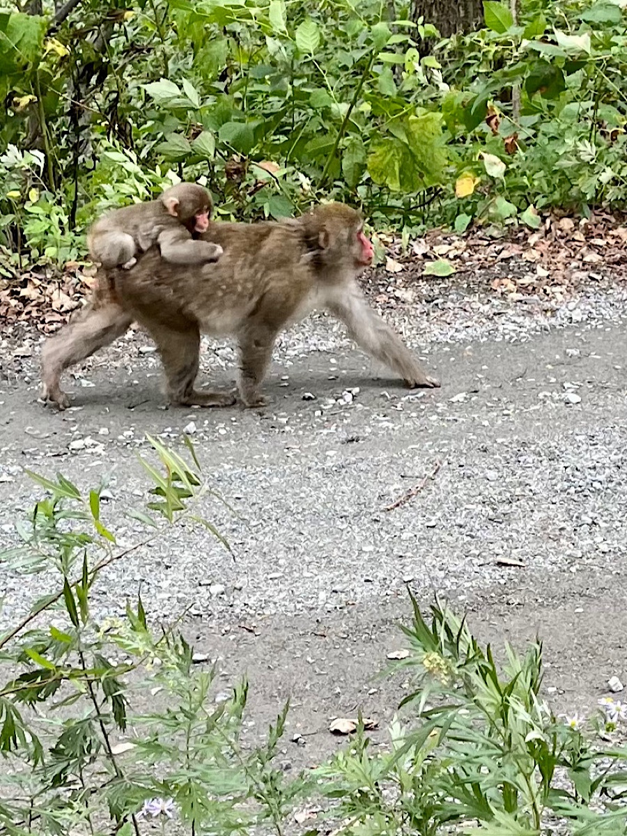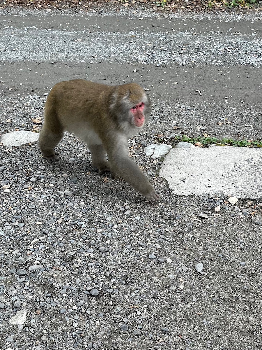 We hiked another mile upriver to Myojin pond, which has a pretty little temple with nice mountain views as well as a charming cafe, where we crossed the river to return on the other bank back to the Kamikochi visitors’ center. It was at the Myojin Bridge that we saw the monkeys—a troop of macaques, better known as Snow Monkeys (minus the snow in this season), playing with their babies, grooming each other, and generally lolling about the river banks in the nice weather. Although we were careful to give them a wide berth, they seemed unbothered by us and passed quite closely a couple of times, so we got some nice pictures.
