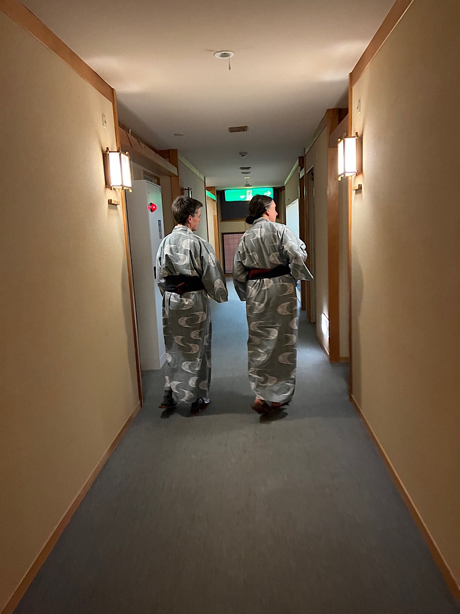 After all of the monkey business, we realized we needed to pick up the pace to make our bus to Fukuji Onsen and our evening’s accommodation, so we hustled the 2 miles back to Kamikochi visitor’s center, picked up our luggage from storage and some road snacks from the excellent gift shop, and caught our bus on time.