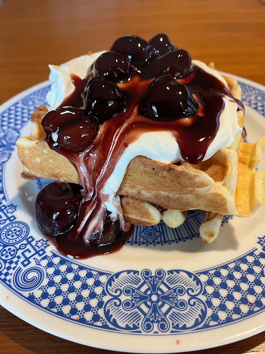 I know: with this post I have officially destroyed any lingering sympathy you might have had for my third bout with COVID. And your suspicions are well-founded. As I’m one of the very fortunate folks for whom the virus is no worse than a middling cold, my COVID infections have all essentially been a staycation, an irreproachable excuse to cancel all my meetings, order frozen pizzas and ramen on Instacart in my PJs, and catch up on work…and baking. Right now I’m working on a batch of whole-wheat (well, part-wheat) Hokkaido milk bread TBB (to be blogged). But that means I had some extra starter to dispose of, and so I whipped up a half-batch of these overnight sourdough waffles from King Arthur. And they were fabulous, seriously. I recommend adding another couple tablespoons of melted butter to the batter and a teaspoon of vanilla–also putting a little rose water in the whipped cream that goes with your cherry (or blueberry or strawberry) sauce. I also recommend eating them in your PJs; they taste better that way.