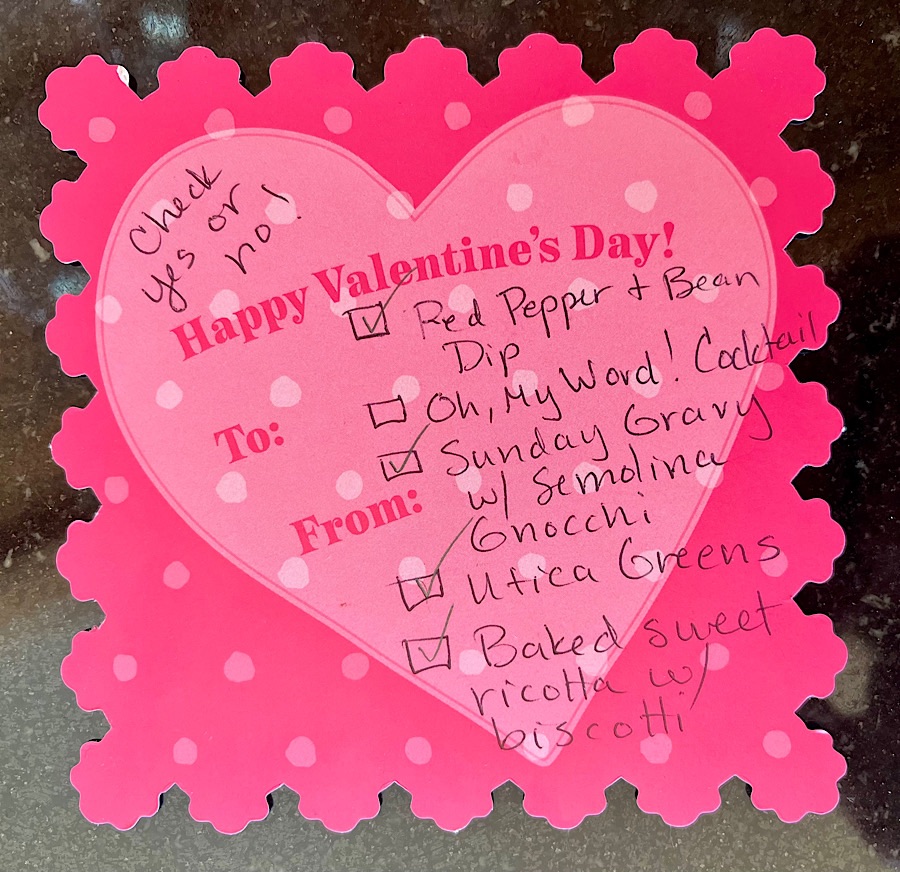 You just can’t beat Italian for Valentine’s Day. The Sunday Gravy was phenomenal—none of us could believe that so much flavor came out of so few ingredients (basically a couple of kinds of meat, garlic, and Italian herbs added to tomato purée). The semolina gnocchi (aka Roman gnocchi) were really interesting—kind of like rustic gougères. I think the Utica Greens would have been wowed us more if we could have gotten hold of escarole, whose juicy texture is crucial to the success of the dish. And for dessert, it was really fun to finally try my hand at making my friend Geri’s delicious anise biscotti recipe, written out in a nice, old-fashioned cursive on a Southwest Dental Laboratories notepad. They didn’t come out quite as well as they do when Geri makes them, but practice makes perfect. Happy Valentine’s, everybody.