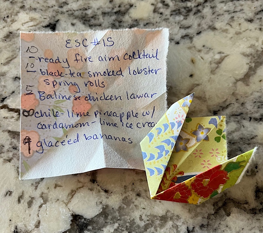 I tried to make glacéed bananas to go with the dessert, but they were a fail; I think it was operator error and not the recipe. Folks were a bit mixed on the lawar, but I liked it. The spring rolls were a hit, but we all voted to change the sauce out for a peanut or sweet chili sauce next time. And everyone liked the smoky mezcal cocktail with the smoky lobster rolls.