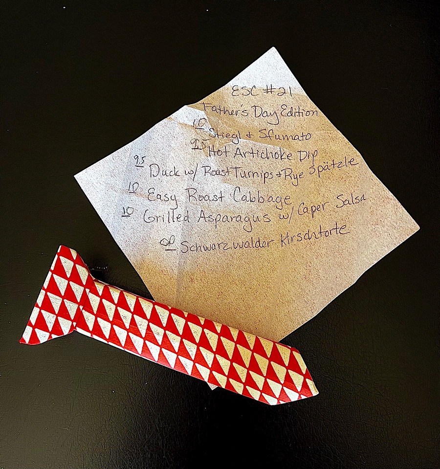 A week late, sorry. I went through my Try file and picked out all the recipes I thought my dad would have liked best. Of course, it ended up skewing German…. The Black Forest Cake was a knockout and not hard at all to make—once you got past the hand-grating of 9 oz of semisweet chocolate (would definitely have to figure out a way to make that step easier if I made this again, maybe one of those rotary graters that you use for Parmesan; I used to have one a long time ago, but it finally broke….) But I think everyone’s favorite, in terms of ROI, was the roasted cabbage, which we did on a sheet pan on the grill. The cute little origami ties are super-easy to fold; I followed instructions here.