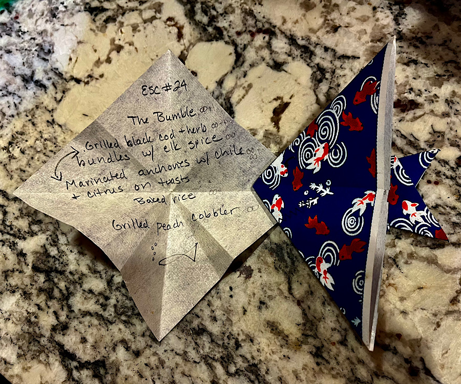 The baked rice and grilled peach cobbler (can’t find the recipe we used, but this is close enough for government work) were much more normal recipes and very delicious. But the sleeper hit of the evening was the marinated anchovies with citrus, raisins, and chiles on toasts, which went great with the chamomile-forward Bumble cocktail. I wouldn’t do this menu again, but it did turn out great!
