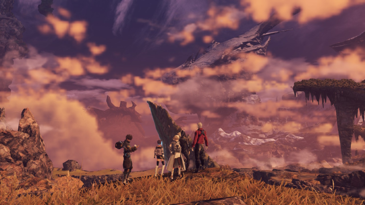 If that sounds a bit too heady, it can be, especially given a couple of logical gaps in the story that are never convincingly bridged. But what kept the story grounded and interesting for me, other than the character development, was the design of the world. Keves, Agnus, and the City are all thoroughly and coherently built out: Keves is loosely patterned after Western European/Scandinavian design and architecture, rendered in gloomy, glowing steampunk blues and blacks; meanwhile, Agnus (my favorite!) layers a decidedly Japanese/samurai aesthetic on a woven origami-paper-white base and finishes it with splashes of jade green and lacquer red; and the City, appropriately, is jury-rigged, patched together from spare parts in rusty browns and greens with Bladerunner-like markets and taverns. And then there’s the outside world, the crazy, jaw-dropping landscape of Aionios. I quickly filled up my Switch’s photo album with screenshots, nearly getting snuffed in battle several times as a result. It’s gorgeously hyperrealistic, giving BOTW a real run for its money in that department. To wit, there’s a function where you can wash the team’s clothes–and you need to, because they really do get the sandy deserts, sooty battlefields, snowy slopes, thundering waterfalls, and viney forests all over them. Aionios resolves into a ring of stony landforms shaped like titan heads, swords, hands, and wings riddled with eery spherical holes from “annihilation” events caused by mysterious accumulations of glowing black fog. Apparently those titans are from an earlier bit of Xenoblade lore that I’m unfamiliar with; but in this game they’re atmospherically iced or grown over with a believably evolved landscape.