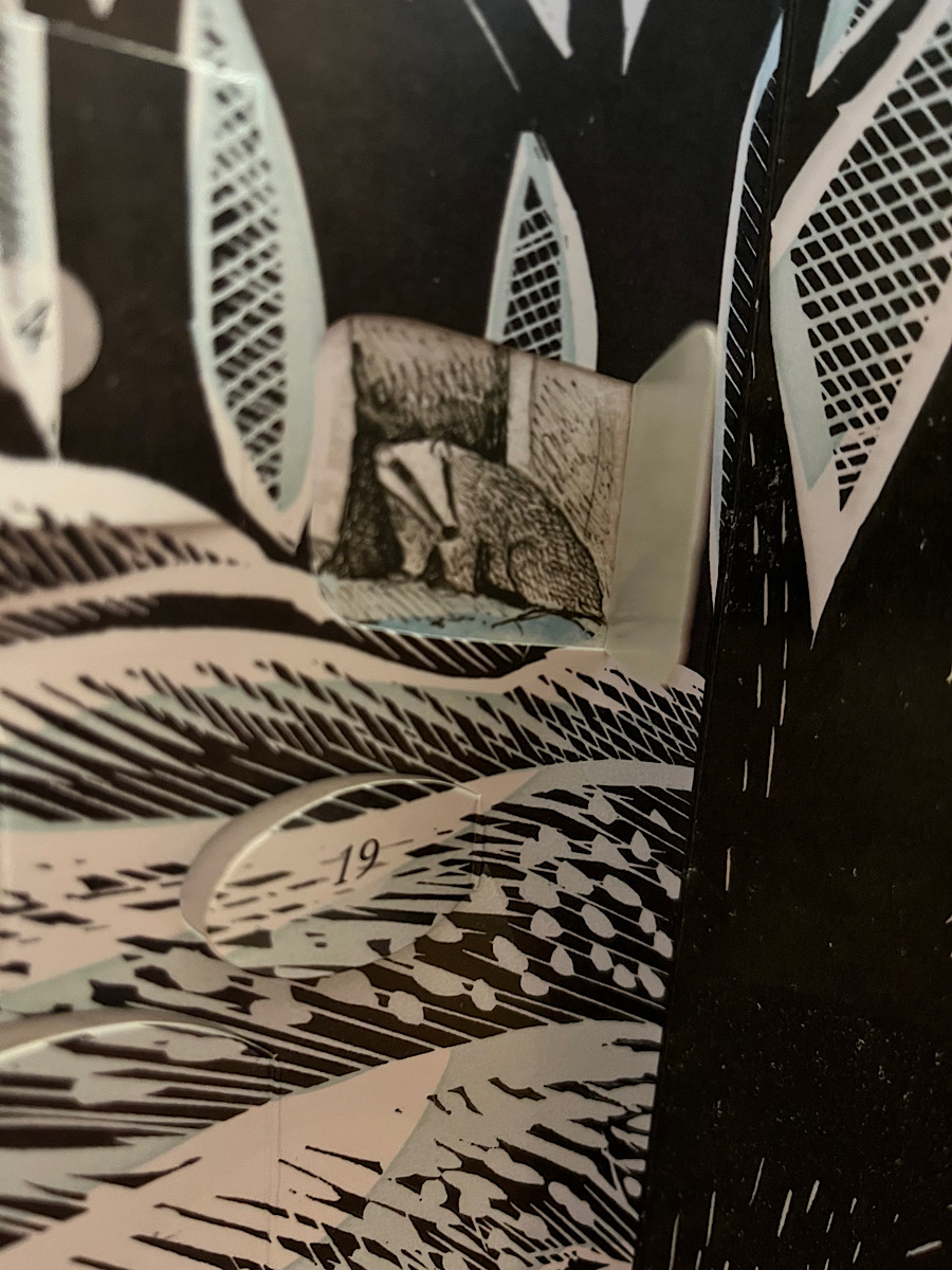 Abigail flew them in a looping, swooping route, now over fields sparkling dull, frosty silver in the light of a half-moon, now under the fringes of woods darker than deep water. At last Armand saw the black gash of “the train” scarring the white horizon. As they came close to it, though, Abigail suddenly pulled up short ahead of him, hovering in place as best an owl can, which is to say awkwardly, at best. Below her, a badger was bumbling his way across the snowy field.