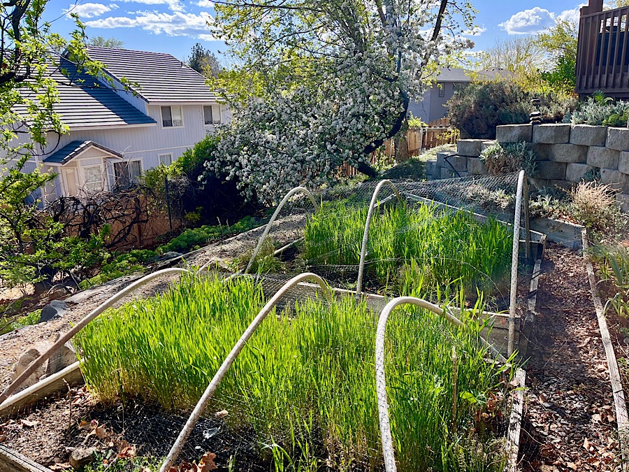 First, I thought: how amazing is it that 1 wheat berry turns into 15 wheat berries (on average)? Not amazing to wheat farmers, but I am not a wheat farmer. Or…I wasn’t until this year. Turns out you need at least 2 1/4 cups of flour to make a baguette, so I calculated I needed 36 wheat stalks. I went to Natural Grocers and bought a bag of hard red winter wheat, planted it this winter in 2 of my garden beds, and watered it every day till it came up. Spoiler alert: “winter wheat” doesn’t grow in the winter; nothing grows in the winter. You sow it in the winter and it comes up first thing in the spring). Oops. Like I said, not a wheat farmer. However, despite my ineptitude, look! Wheat! It’s getting little heads and everything. And there’s way more than 36 of them. So, I’ll keep you posted on Operation Baguette.