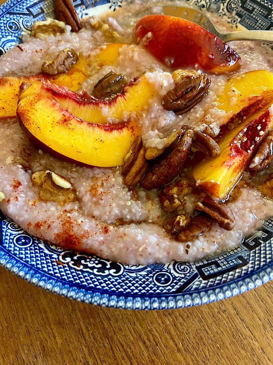 BTW those are Unicorn grits up there from Marsh Hen mill, a very cool traditional mill on Edisto Island. They have an amazing floral aroma in addition to the natural orchid coloration. I had them with peaches, honey, butter, pecans, and of course a little chile molido because you can take the girl out of New Mexico but….