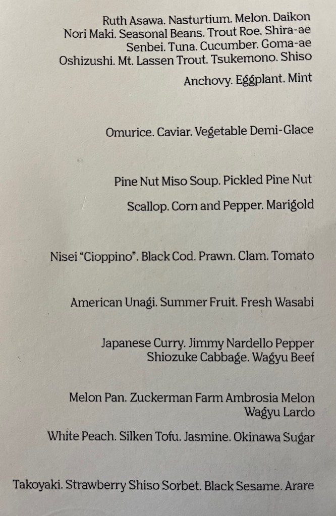 A little about Nisei, which means “second-generation” in Japanese and refers to children of Japanese immigrants to the U.S., which is what Chef David is—raised in Houston but a frequent visitor to his father’s family in Japan often, where he learned washoku—home cooking, built around the concept of ichiju sansai (one soup, three side dishes, with rice of course). After culinary school, he staged in Michelin-starred restaurants both in the U.S. and Tokyo (his bio is here if you want more details). He opened Nisei in 2021; in 2022, the restaurant received its first Michelin star and has held onto it every year since then. They’re currently gunning for two stars (and I have every expectation of success for them).