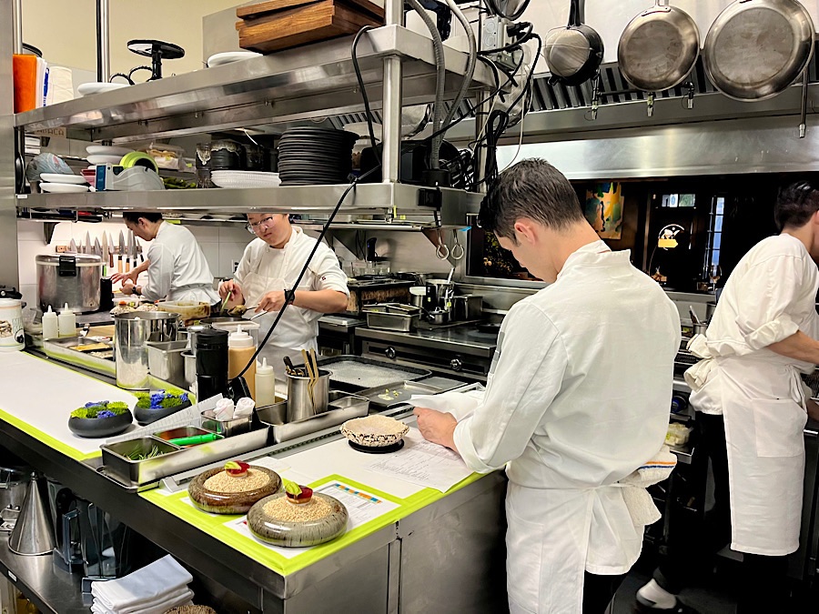 3:00 pm Family meal; we filled our plates with the delicious chicken-and-rice, salad, and cookies that the chefs had ingeniously prepared from leftover ingredients in the cooler. I sat out in the cool sidewalk seating left over from COVID with the chefs and listened to them talk kitchen business. I asked just a few questions about how long they had been at Nisei, why they had been interested in working there, where they had been before: there’s really a diverse range of life experience at the restaurant, and I think it’s one of many reasons the food has gotten even better than when I ate there the first time in 2021. Chef David invites his team to contribute their ideas to the ever-changing menu, and their ideas come from all over the place, literally.
