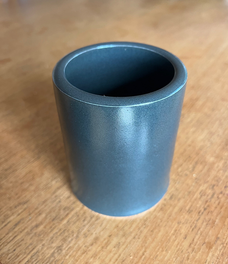 Just picked up 8 of these. They look black most of the time, but in this light you can see they’re actually dark navy. I thought they would be too large to hold comfortably without a handle but am really enjoying drinking out of them: they cool hot tea down nicely and keep it warm with the retained heat in the cylinder walls while warming your hands!