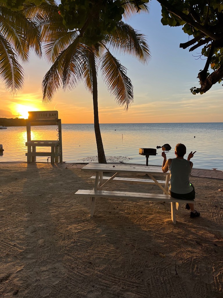 It always takes time to set up the bikes and trailer and get everything adjusted, but we were rolling out of the Publix in Key Largo a little before noon. We enjoyed an active tailwind (first in my life!) and mid-70s temps as we rode largely intact and clean trails to a fabulous mid-afternoon break at Florida Keys Brewing Company on Islamorada: the keys have these tropical beer gardens that are shady and breezy and usually have a taco truck or something that sells fruit juices and non-alcoholic drinks—highly recommend stopping at these. After clocking a total of 35 miles of mostly easy riding, we stopped for the night at Lime Tree Bay Resort (Layton, Long Key), where the manager graciously upgraded us to gorgeous beachside rooms just in time for us to walk out and catch the sun sinking into the calm leeside gulf waters. We got conch fritters for dinner at the on-site restaurant and tried our first key-lime pie of the trip: excellent graham-cracker crust but a little too much sweetened condensed milk in the filling for our tastes.
