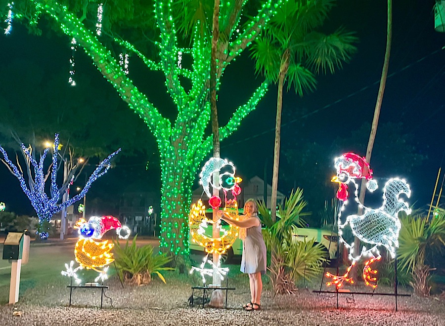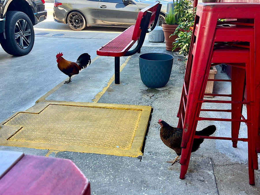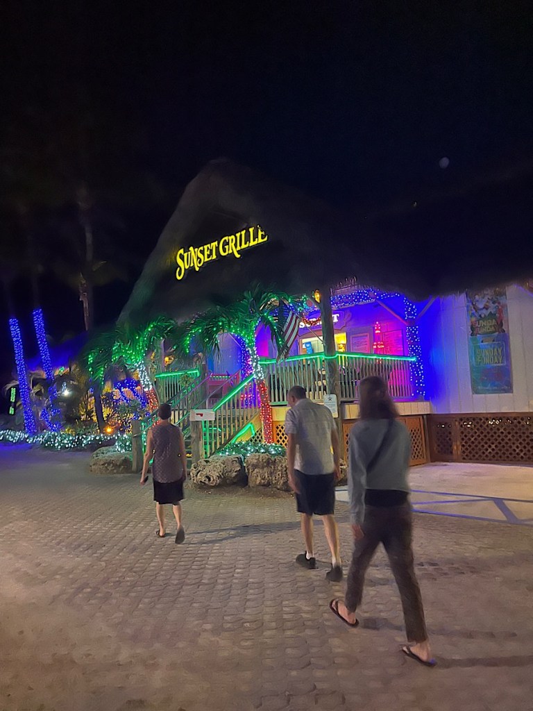 This was a really long day, but it wasn’t miserable because we stopped a lot. We hit up Bahia Honda State Beach just after crossing Seven-Mile Bridge for a cool-off dip in the early morning with no one around, then Coco’s, then we hung out for quite a while at Morita’s in Cudjoe key waiting for Chris and Sam, who had been held up a bit with a minor mechanical. The food was fantastic: we started with coffees and juices and then went back for the best “Cuban Mix” sandwich I’ve ever had. The shade and breeze were awesome, and there’s a little ice cream stand there. After that we just took our time and frequent breaks; it was the toughest riding of the trip with many on-road segments on narrow shoulders. For the last 15 miles of the trail however (technically the first 15), the trail was intact and well-maintained, so this was a big relief. We rolled into Ocean’s Edge Resort and Marina on Stock Island (just east of Key West) around 5 pm with 46 miles under our belts for the day. We were tired but not wrecked and rallied for a shuttle into the old town center of Key West for dinner. We weren’t prepared for how touristy it was: I guess when you read about the Keys, you read about how “relaxed” they are, but Old Town Key West definitely had a Bourbon Street-meets-Carmel vibe with the usual run of tourist-trappy Key Lime Cigar shops, boutiques with chicken paraphernalia (feral chickens are doing very well for themselves on the Keys), and drunk-art galleries (you’ve seen them: they have terrible paintings of dolphins jumping in front of the sunset and wine glasses with jazz pianists reflected in them that people only buy when they’re very unsober). There were also lovely streets with their unique gingerbread plantation houses decorated for Christmas, and cozy little cafes and fine-dining nooks. I’m sure in the off season (whenever that is), the town is delightful. The rest of the time, it’s pretty WOOOOOOOOH!!