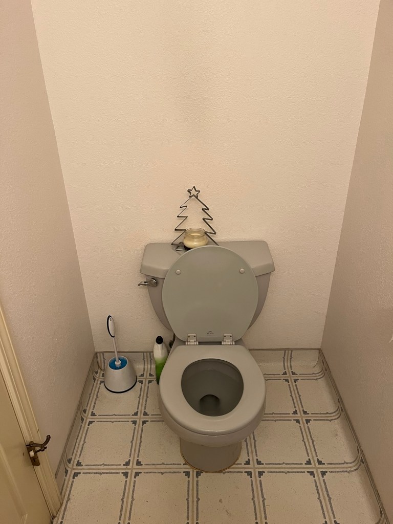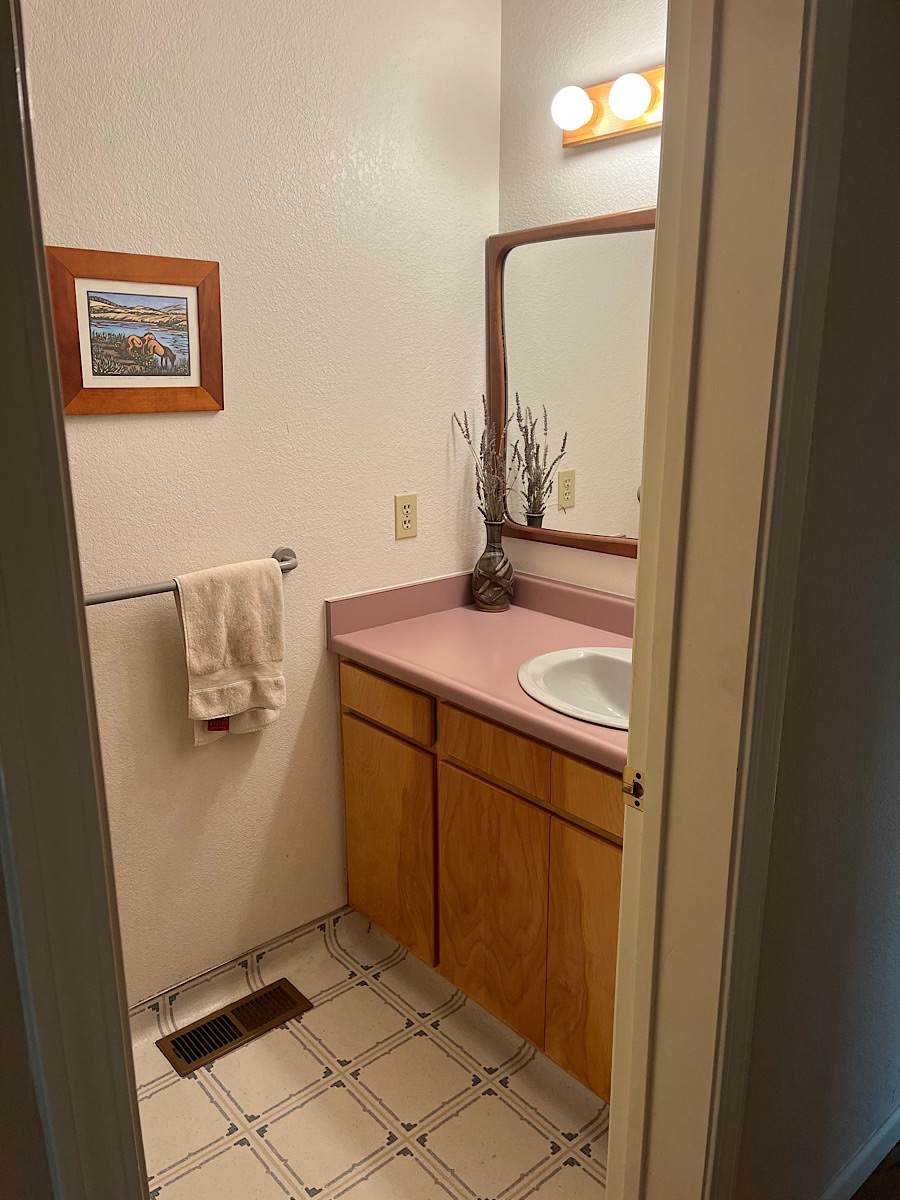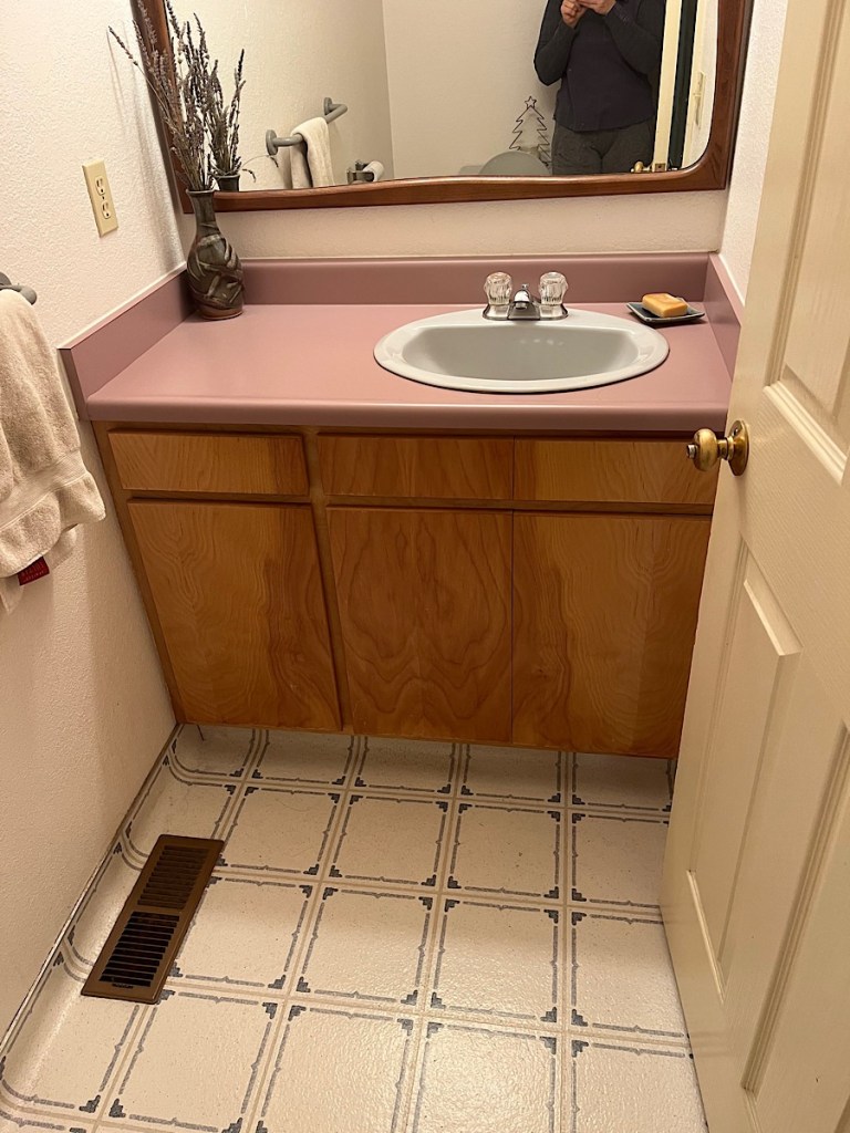 The powder room is the only room on my main floor that is still living in the 1980s. I mean, that was a good decade, but mauve is not a color that should have ever been put on Formica (or perhaps anywhere? Not a fan). Also, pink and blue vinyl floor is not my favorite. So, it was time for a facelift: floors, countertop, walls, fixtures. I love the gray toilet and sink, so they’re staying, and I’m painting the vanity a light cement gray to go with the tile I got for $3 a sq ft. I should be able to do the whole thing for under $1K since I’m doing most of the labor (hopefully just the countertop fabrication and installation will be outsourced, but we’ll see).