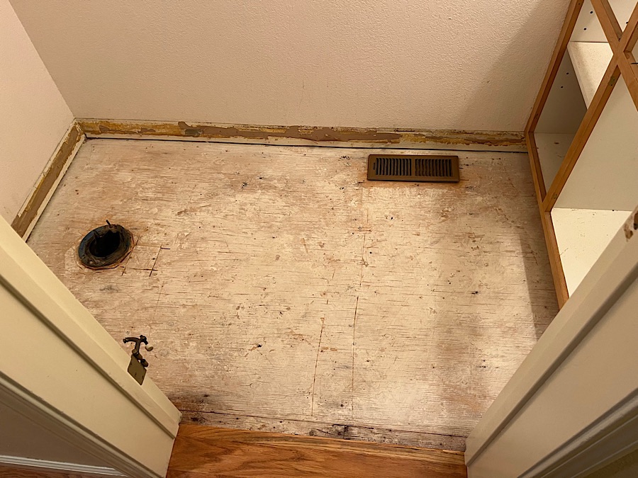 - The false subfloor: This very helpful video seemed to indicate that if there were a false subfloor, it was ideal to pull it out and get back down to the real subfloor before installing backer-board, etc. for a new floor. I agreed it would have been ideal in terms of spacing, as it was 3/8” particle board, and taking it out would put the final tile floor basically flush with the hardwoods in the hall as well as flush or a bit below the toilet flange, which is ideal (you don’t want the flange recessed w.r.t. the finished floor as that can lead to leaks as the wax ring collapses over time and leaves a gap between the toilet base and the flange anchoring the toilet to the sewer line. BUT the $1M question was if the particle board were glued down…if so, trying to pull it out would just be a lot of work that would result in a nightmare just as bad if not worse than trying to scrape the rest of the vinyl floor backing off the false subfloor. But, the video seemed to suggest that backer board for vinyl would just be nailed down, not glued down. So I decided to cut a test section out of the false subfloor and see what I was dealing with. Great news: it was lovely and clean, just nailed down without too many nails, and it came right up with some prybar work. So I gambled and won on that one.