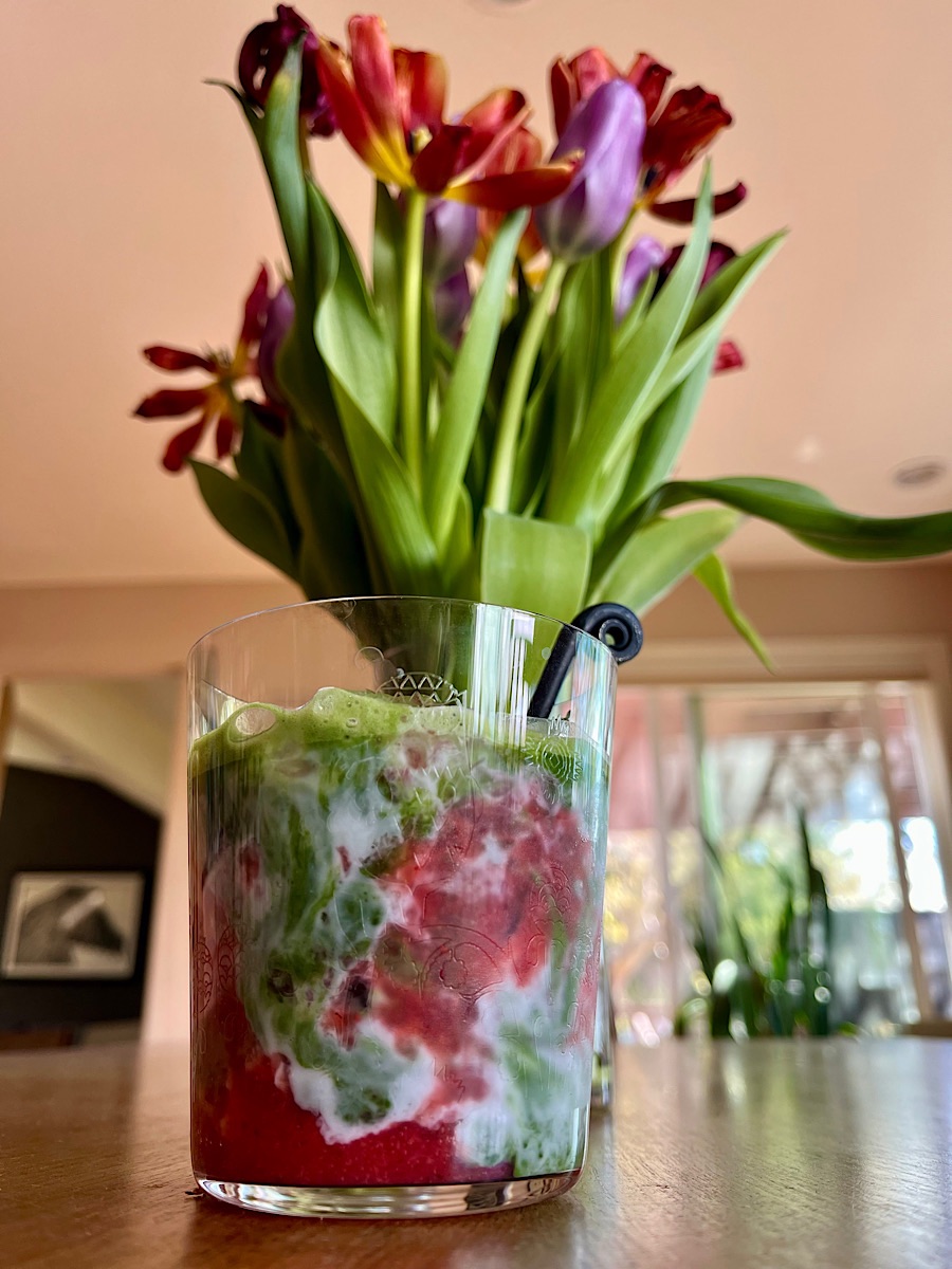 I’m not a matcha latte kinda girl. I don’t like bitter matcha at all (I’m a super-taster, so bitter tastes are really cranked up to 11 for me), so I tend to buy really expensive matcha when I do buy it—which means I’m not going to turn around and dump it into a latte…. But serendipitously a couple of weeks ago, I bought perfectly decent grocery-store Matcha: Aiya, a brand that was new to me but which, it turns out, Michelle Kanemitsu (she of the “how to whisk matcha” video I posted earlier this week) also recommends. AND I came into possession of some nice strawberries that weren’t going to last. So, I puréed the berries with a bit of sugar and have been enjoying strawberry matcha lattes this week (with coconut milk). The strawberry and matcha flavors play together very nicely, and the mouthfeel of the latte is really creamy and silky—maybe because of the natural pectin in the purée. Anyway, if you want to try one for yourself to celebrate blossom season, here’s Namiko Chen’s recipe.