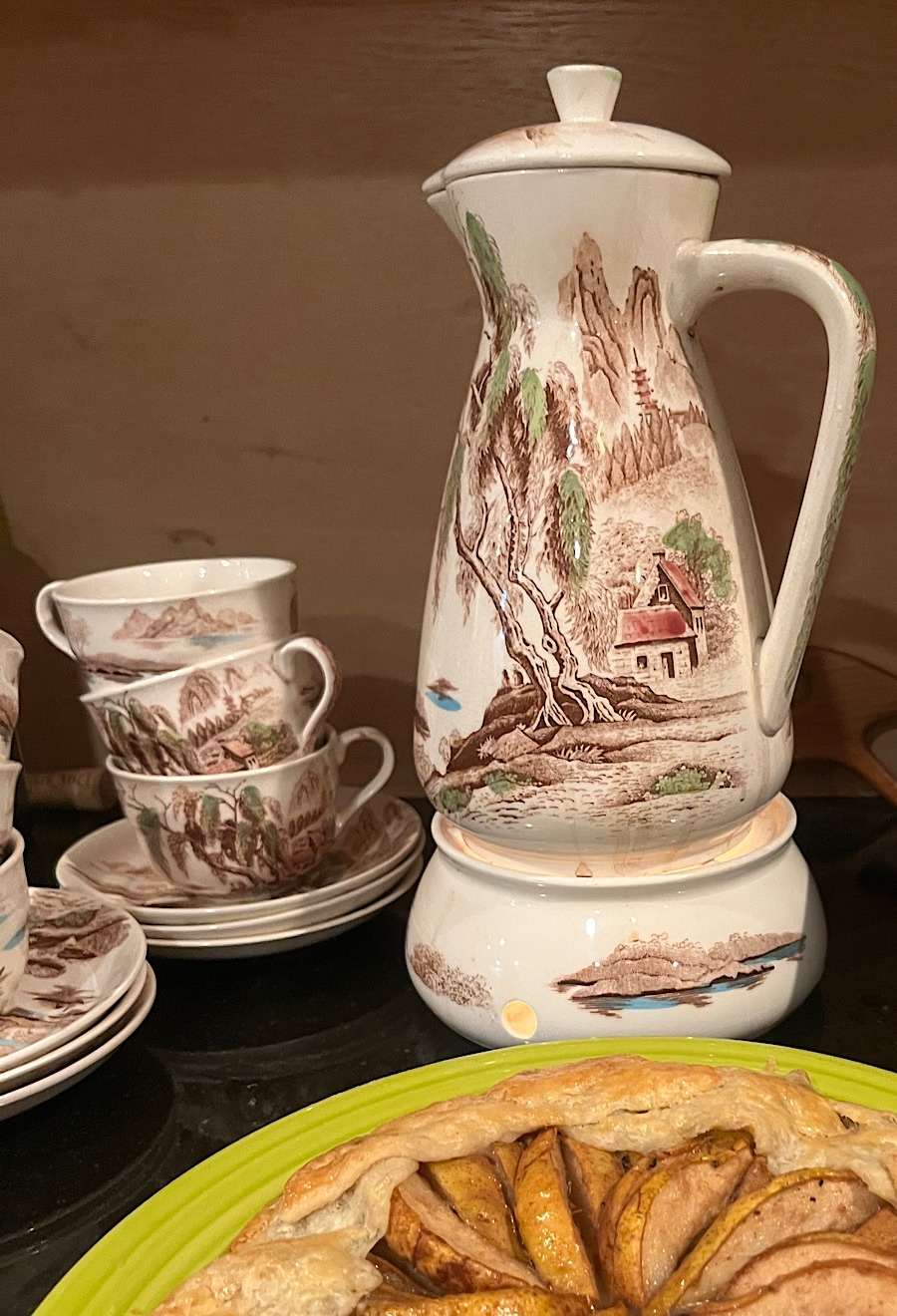 I came across the coffee pot from the Nasco Sayonara pattern at a local thrift store; I’d never seen it before. The pitcher was missing the lid, so I figured it could be a flower vase and/or orchid waterer. But then I just couldn’t stop staring at it on my windowsill, admiring how well it went with my home decor scheme, which is basically earth tones with pops of turquoise and red (b/c you can take the girl out of New Mexico, but….) So, I made the wild decision to rehome my Blue Willow, which I started collecting as a kid with coupons from Bag ‘n’ Save. Big move—but also, it’s OK to enjoy something and then move on. Then, I went on a mission to collect 12 place-settings of the Nasco Sayonara, which wasn’t an absurdly expensive or difficult project but still required a spreadsheet, as they stopped making the pattern in the 1960s, and so it takes a bit of putting together lots from EBay, etc. to get that many place-settings. I also had to watch the quality because the glaze wasn’t that amazing, and so a lot of pieces are crazed and/or stained. (Stay tuned for a follow-up post on cleaning stained porcelain….) The most exciting part was when I had trouble figuring out how to get a big lot from a shop in rural Louisiana that didn’t ship, and then it JUST SO HAPPENED that my best friend was going to a clarinet conference in that *exact* small town in Louisiana. Go figure, as we used to say. So, she picked it up for me and took it to a UPS store in Shreveport to ship out. I will forever owe her.